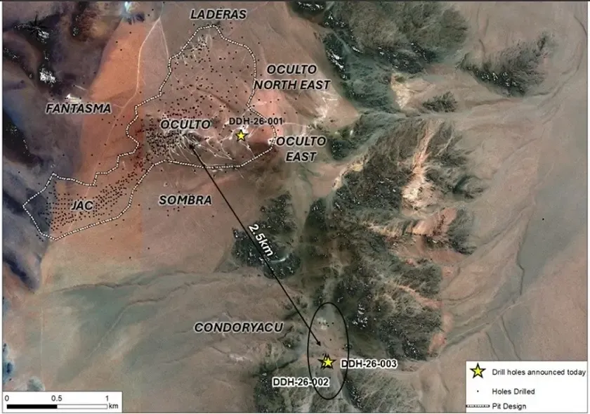 En paralelo, los trabajos en Oculto Este continúan ampliando la huella mineralizada del proyecto. El primer pozo de la Fase VI confirmó la extensión lateral del sistema de óxidos más allá de los límites conceptuales de la mina a cielo abierto, evidenciando continuidad y potencial de crecimiento tanto en superficie como en profundidad.